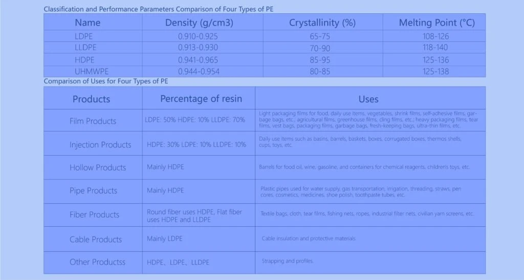 LDPE, short for Low-Density Polyethylene, is typically produced using high-pressure methods (14.17196.2 MPa), hence also known as High-Pressure Polyethylene. Due to the high-pressure production method, LDPE molecules contain a significant number of long and short branches (an average of 21 branches per 1000 carbon chain atoms), resulting in low crystallinity (4% to 65%) and low density (0.9100.925). It is lightweight, flexible, has good resistance to low temperatures and impact, making it the lightest variety among polyethylene resins.